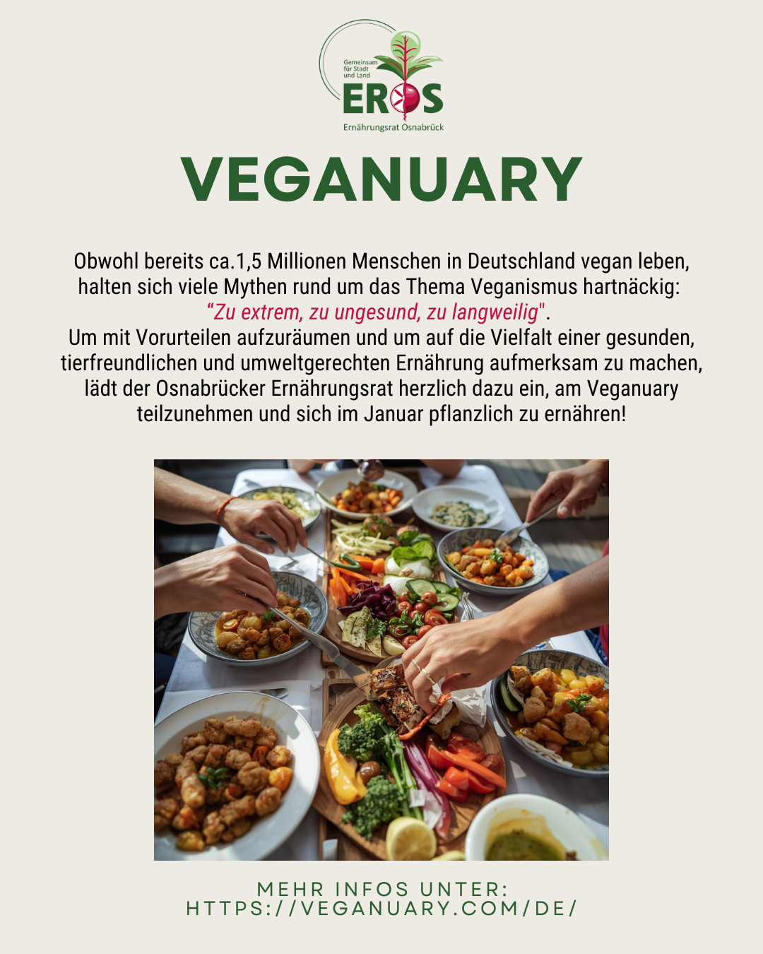 Obwohl bereits etwa 1,5 Millionen Menschen in Deutschland vegan leben, halten sich viele Mythen rund um das Thema Veganismus hartnäckig: „Zu extrem, zu ungesund, zu langweilig“, um nur einige zu nennen. Der Ernährungsrat Osnabrück Stadt und Land e.V. möchte herzlich dazu einladen, sich im Januar pflanzlich zu ernähren, um die Vielfalt einer gesunden, tierfreundlichen, klima- und umweltgerechten Kost kennenzulernen. Täglich gibt es leckere Rezepte und weitere Infos auf der Homepage der weltweiten Kampagne Veganuary.com.